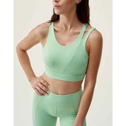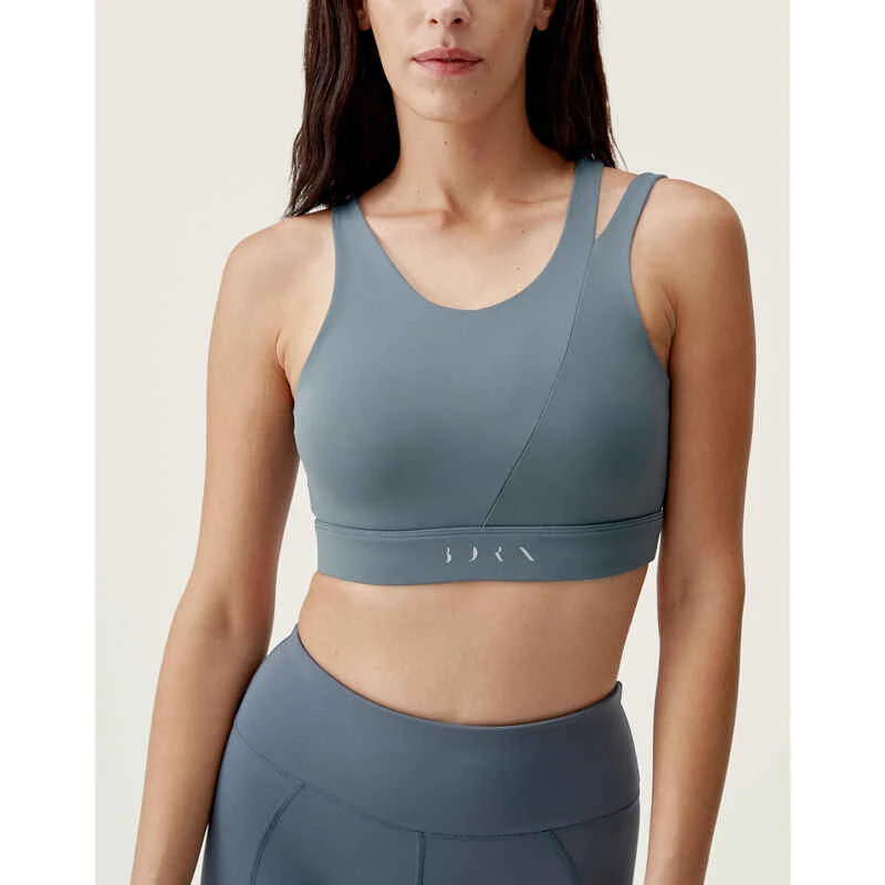 Sport-BH mit Asymmetrie für einen eleganten Look, mit mittelhohem Halt, mit bequemen Trägern. Stoff Stoff „Shapplex_B“. Mesh-Innenfutter für mehr Leichtigkeit. · Nachhaltige Fasern · 4-Wege-Stretchmaterial · Weicher Griff · Schnell trocknend · Antibakteriell · Antistatisch · Mittlerer bis hoher Halt · Herausnehmbare Polster