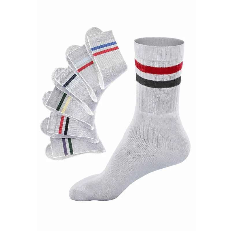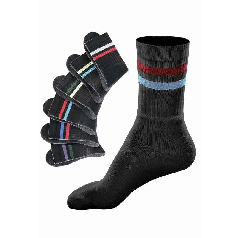 Jetzt bestellen! Vielseitige Basics für jede Gelegenheit. Einfach nach Lust und Laune kombinieren. Basic-Socken für sportlich Aktive! Auch bei hoher Belastung bleibt das Fußklima frisch und die Socke verrutscht nicht. Dank Frotteesohlen und verstärkter Ferse ist dieser Workoutpartner besonders gut gepolstert und bleibt lange so gut wie neu. Das pflegeleichte Material wirkt schweißaufsaugend und hält die Füße angenehm trocken.Jetzt bestellen: Im sportiven Look mit farbigen Ringeln unter dem Bündchen. Erhältlich als 6er-Pack.Details: Guter Sitz durch Rippenstrukturverstärkte Belastungszonen für optimale Haltbarkeit Vermeidung von Druckstellen durch Frottee Zwei-Faser-QualitätgeringeltMaterial: diverse Faserarten