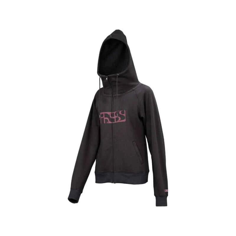 Klassischer, taillierter Frauen-Hoody mit lila iXS-Schriftzug auf der Brust. Der Hoody verfügt über zwei offene Taschen und einen durchgehenden Reißverschluss.